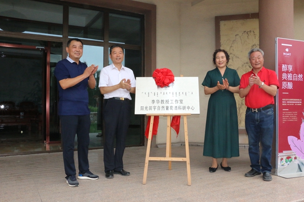 在乌海市阳光田宇国际酒庄,为了感谢李华教授长期对该企业葡萄酒生产的鼎力支持,酒庄专门为李华教授建立了工作室,21日上午,乌海市副市长刘素红、酒庄董事长田旺荣与李兴旺、李华共同为“李华教授工作室阳光田宇自然葡萄酒成人av中心”揭牌。调研交流中,刘素红希望能够通过学校的全方位支持,带动当地农民脱贫致富,科学治理沙漠,让乌海市能够和谐、绿色、持续发展,推动沙漠葡萄酒快速走向世界。