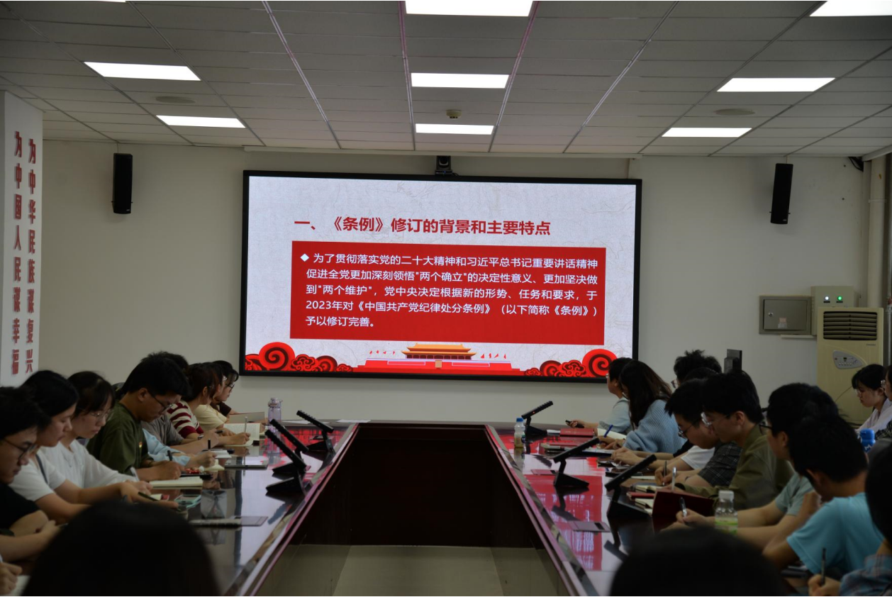 张洁以“学纪、知纪、明纪、守纪”为主题,介绍了《中国共产党纪律处分条例》的出台背景和历次修订情况,对《条例》重新修订的时代要求和主要特点进行了全面解读,并结合《条例》内容,通过一系列鲜活生动的案例,对全体学生党员提出了具体要求。